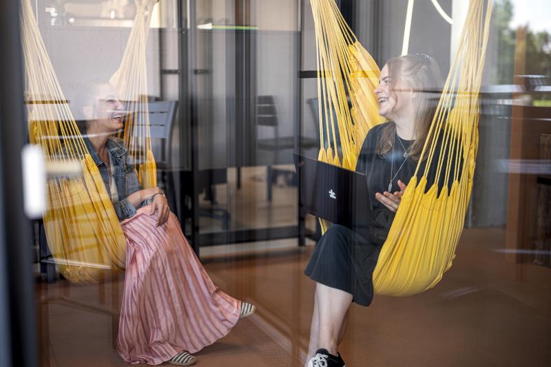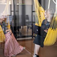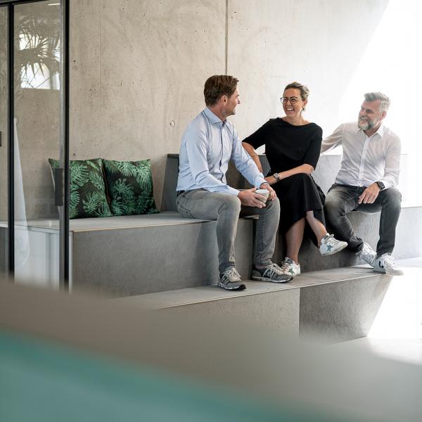 Beim Style und der Einrichtung haben sich Neuhauser und Co. von Großkonzernen wie Microsoft und Google inspirieren lassen. „Wir waren vor vier Jahren in Irland bei diesen Firmen und haben dort diese Art zu Arbeiten gesehen. Dort gab es auch so einen Aulabereich – einfach lässig informell. Genau das haben wir so, wie es für uns passt, hier in unserem Büro umgesetzt. Es hat etwas von diesem Aula-Charakter, wenn die Leute miteinander essen. Das ist schon sehr charmant.“ Gerade die Komfortzone mit den Hängesesseln dürfte bei vielen Arbeitnehmer:innen auf neidische Blicke stoßen. Ob denn auch schon mal jemand eingeschlafen ist, wollen wir mit einem Augenzwinkern von den Geschäftsführer:innen wissen. „Nein, das ist noch nicht passiert. Es muss aber auch Raum und Zeit für eine kurze Plauderei geben. Es ist uns schon wichtig, dass unser Team die Zeit effizient nutzt. Auf der anderen Seite muss es jedoch auch erlaubt sein, dass sich die Leute miteinander austauschen und Spaß haben“, stellt Daniel Frixeder, der zusammen mit Neuhauser die Firma vor 25 Jahren gegründet hat, klar.